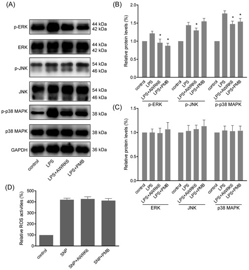 MAPKs were involved in the protection of AWRK6 against liver injury. (A) The phosphorylation and total proteins of MAPKs including ERK, JNK and p38 MAPK in HepG2 cells were analyzed by western blotting, following the treatment with LPS (40 μg/mL) and AWRK6 (200 μg/mL) for 2 h. (B) The phosphorylation of MAPKs was analyzed by ImageJ. (C) The total proteins of MAPKs were analyzed by ImageJ. (D) The ROS level in HepG2 cells treated by 400 μM sodium nitroprusside (SNP) with/without AWRK6 at 200 μg/mL for 6 h, assayed by Reactive Oxygen Species Assay Kit. The results were presented as fluorescence intensity, percent of control. * p < 0.05 compared with the LPS groups.