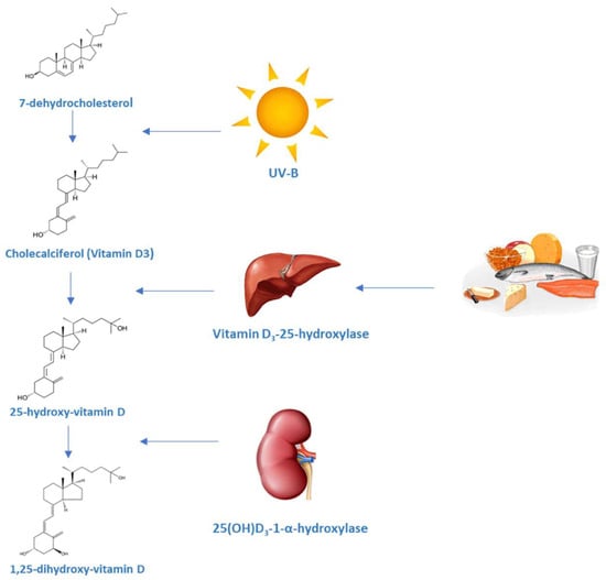 Vitamin D (vit D) is a fat-soluble steroid synthesized in several steps which ends with the formation of vit D3 or calcitriol, the most active form of vit D. It is known for its role in the regulation of calcium and phosphorus levels as well as bone mineralization. The term vitamin D is imprecise and groups together different components that are part of this family of steroid hormones. Firstly, pre-D3 is produced in the skin from 7-dehydrocholesterol after exposure to ultraviolet irradiation. Besides, this irradiation also produces lumisterol and tachysterol from pre-D3. The synthesis of lumisterol is a reversible process and can be converted back to pre-D, which binds to Vitamin D-binding protein (DBP) and is subsequently removed from the skin. Pre-D3 has to be hydroxylated twice to became fully activated. The first hydroxylation occurs in the liver and, to a lesser extent, in other tissues by 25-hydroxylase (CYP2R1) to produce 25(OH)D. This is the principal circulating form of vit D and provides a clinically useful marker for vit D status. In the kidney, the enzyme CYP27B1 hydroxylates 25(OH)D, which is then converted into 1,25(OH)D. This process is stimulated by parathyroid hormone and inhibited by calcium, phosphate and fibroblast growth factor 23 (FGF-23). CYP27B1 can be also found in other tissues including epithelial cells, immune cells and parathyroid glands. The extrarenal production of 1,25(OH)D is under a different control, mainly by cytokines such as tumour necrosis factor α (TNFα) and interferon γ (IFNγ). In the kidney, the catalytic enzyme CYP24A1 is the responsible for the inactivation of 1,25(OH)D producing 24,25(OH)D []. Several oxidative reactions after 24-hydroxilation and conjugation with glucuronic acid generate some compounds that are excreted through the bile.