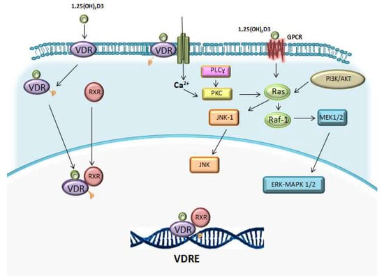 Three different MAPK signalling cascades are implicated in 1,25(OH)2D3-induced cell growth arrest and differentiation: Raf-1/MEK/ERK MAKP, JNK/MAPK and p38/MAPK pathways [].