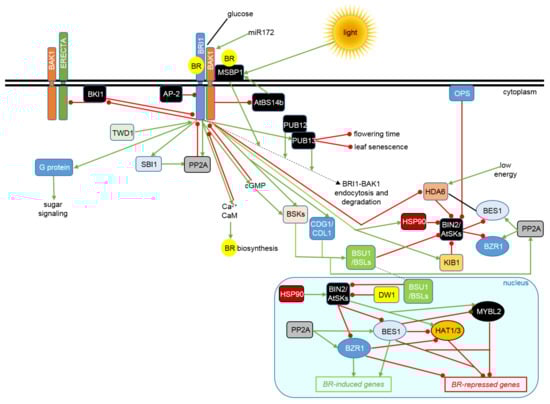 The BZR1 and BES1 transcription factors constitute a core of the complicated network, which coordinately regulates the BR-dependent gene expression []. The complicated mechanism, which coordinately regulates the BR-dependent gene expression is shown in Figure 2. They are central factors that interact with a broad range of regulators and cofactors to modulate various developmental processes []. Moreover, recent discoveries indicated that these transcription factors represent an integration node of numerous signal transduction pathways, and this integration hub enables a coordinated regulation of various physiological processes in reaction to environmental and stress conditions []. An accumulating body of evidence provides new information about proteins interacting with and modulating activity of these transcription factors. It was reported that BZR1 directly interacts with and is phosphorylated by components of the Mitogen-Activated Protein Kinase (MAPK) complex, what indicates that BZR1 is post-translationally regulated by the MAPK pathway. Mechanism of the BZR1 regulation through phosphorylation may be quite complicated, as apart from 25 putative BIN2-mediated phosphorylation sites BZR1 is predicted to contain 11 phosphorylation sites for other kinases []. Phosphorylation status of BZR1 may also be regulated by other proteins. Interaction between the cyclophilin protein CYP20-2 and BZR1 stimulates the BZR1 phosphorylation and alters its conformation to repress its inhibitory transcriptional effect on the gene encoding a key regulator of flowering—Flowering Locus D (FLD) []. BZR1 interacts also with histone deacetylase HDA19 (HDA19), and this interaction is required for normal function of BZR1 and its role in regulating target gene expression []. Recently, a new component of the regulatory network has been identified. BZR-SENSITIVE-SHORT HYPOCOTYL1, also known as BLADE ON PETIOLE1 (BSS1/BOP1), is a negative regulator of the BR signaling. The BSS1/BOP1 gene encodes a protein with ankyrin repeats, which regulates leaf development. The BSS1/BOP1 protein interacts with the BZR1 and BES1 transcription factors to form a cytosolic complex. Thus, the BSS1/BOP1 complex inhibits the BZR1 transport from the cytosol to the nucleus, and consequently negatively regulates the BR signaling. The protein complex is dissolved by the BR treatment, which enables the BZR1 transport to the nucleus. Moreover, the BSS1/BOP1 gene expression is decreased by BR [] (Figure 2).