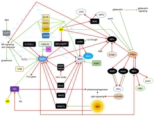 The complicated mechanism, which coordinately regulates the BR-dependent gene expression, with the BZR1 and BES1 transcription factors as hubs of the regulatory network. Transcription factors are shown as ovals, other proteins are depicted as rectangles. Green arrows indicate stimulation, whereas red lines with the bullet points represent suppression. Detailed description is given in the text.