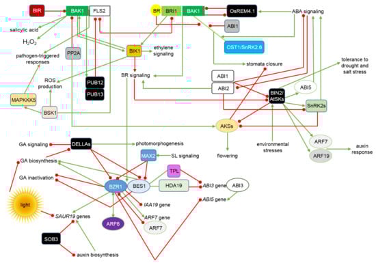 Crosstalk mechanism between the BR signalosome and the signaling pathways of other phytohormones. Transcription factors are shown as ovals, other proteins are depicted as rectangles. Green arrows indicate stimulation, whereas red lines with the bullet points represent suppression. Detailed description is given in the text.