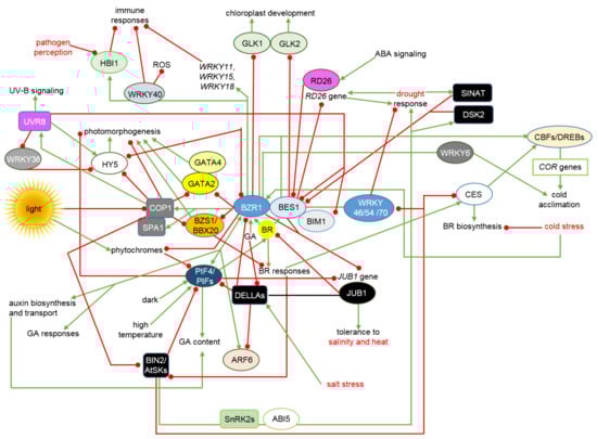 The BZR1 and BES1 transcription factors are hubs in the network of interactions with various environmental and stress signaling pathways. Transcription factors are shown as ovals, other proteins are depicted as rectangles. Green arrows indicate stimulation, whereas red lines with the bullet points represent suppression. Detailed description is given in the text.