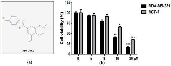 Effect of Moracin D on cytotoxicity in MDA-MB-231 and MCF-7 cells. (a) Chemical structure of Moracin D. Molecular weight = 308.3. (b) Cells were seeded onto 96-well plates and treated with concentrations of Moracin D (0, 5, 8, 16, 20 μM) for 24 h. Cell viability was evaluated by by 3-[4,5-dimethylthiazol-2-yl]-2,5 diphenyl tetrazolium bromide(MTT) assay. Data represent means ± SD. * p < 0.05, ** p < 0.01, and *** p < 0.001.
