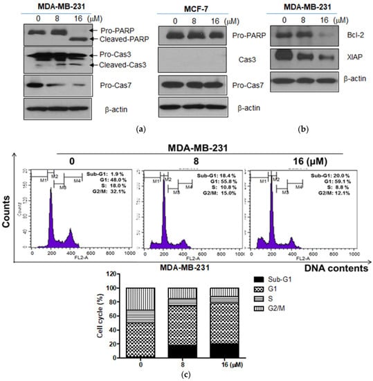 Effect of Moracin D on apoptosis related proteins and apoptosis portion in MDA-MB-231 cells. Human breast cancer cells (MDA-MB-231, MCF-7) were treated with Moracin D for 24 h. (a) Cell lysates were prepared and then subjected to Western blotting with antibodies of caspase-3, procaspase-7, and cleaved poly (Adenosine diphosphate ribose (ADP-ribose)) polymerase (PARP). (b) MDA-MB-231 cells were treated with Moracin D (0, 8 or 16 μM) for 24 h and subjected to Western blotting for B-cell lymphoma 2 (Bcl-2) and X-linked inhibitor of apoptosis protein (XIAP). (c) The stained cells by propidium iodide (PI) were evaluated by fluorescence-activated cell sorting (FACS). The bar graphs show quantification of cell cycle population (%).
