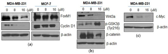 Effect of Moracin D on expression of Forkhead box M1 (FOXM1), Cyclin D1, Wnt3, glycogen synthase kinase 3 beta (GSK3β), β-catenin, and c-Myc in MDA-MB-231 cells. MDA-MB-231 and MCF-7 cells were treated with Moracin D (0, 8, or 16 μM) for 24 h and were subjected to Western blotting with antibodies of FOXM1 and Cyclin D1 (a) and also with those of Wnt3, p-GSK3β, β-catenin, and c-Myc (b,c).