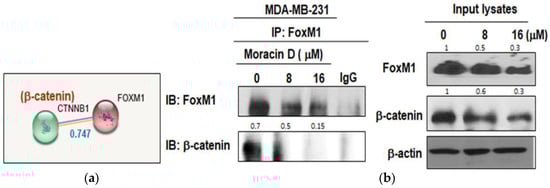 To confirm the inhibitory effect of Moracin D on interaction between FOXM1 and β-catenin, immunoprecipitation was performed in the MDA-MB-231 cell treated by Moracin D. The score of protein–protein interaction (PPI) between FOXM1 and β-catenin was known 0.747 by String database (Figure 4a). As shown in Figure 4b, Moracin D suppressed the binding of FOXM1 and β-catenin in MDA-MB-231 cells in a concentration dependent manner.