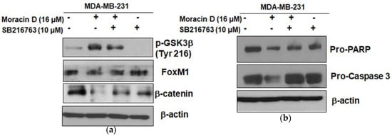 Effect of GSK3β inhibitor SB216763 on pro-PARP, pro-caspase3, FOXM1, and β-catenin in Moracin D treated MDA-MB-231 cells. Cells were treated with Moracin D (16 μM) for 24 h one hour after pre-treatment with 10 μM SB216763 GSK3β inhibitor. Then, Western blotting was performed for FOXM1, β-catenin (a), pro-PARP, and pro-caspase3 (b).