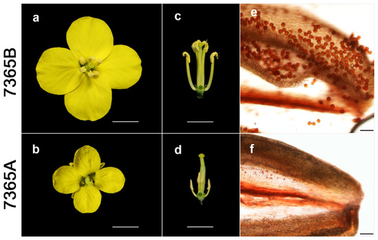 Figure 1. Phenotypic characterization of fertile and sterile lines. (a,b) Vertical-view of open flowers; (c,d) Side-view of flowers without calyxes and petals; (e,f) Acetocarmine-stained anthers; a, c and e are 7365B; b, d and f are 7365A. The scale bars are 5 mm for a, b, c and d, and 100 μm for e and f.