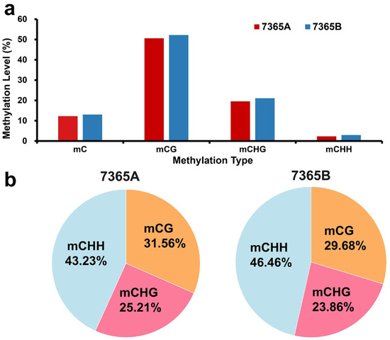 Figure 2. Genome-wide DNA methylation patterns of 7365A and 7365B. (a) Average methylation levels of CG, CHG and CHH in the whole genome; (b) Percentages of methylated cytosines under each context.