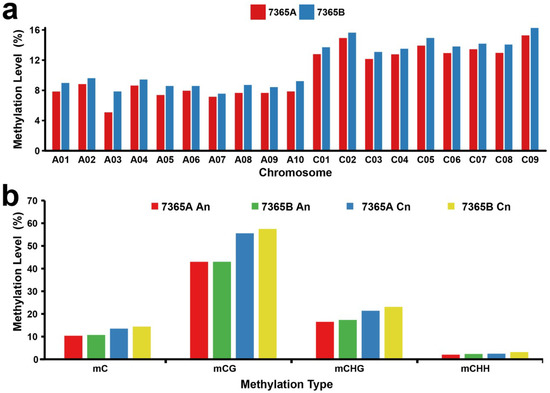 Figure 3. Chromosomal distribution of the global DNA methylation patterns of 7365A and 7365B. (a) DNA methylation levels in nineteen chromosomes. (b) Mean DNA methylation levels of the An and Cn subgenomes.