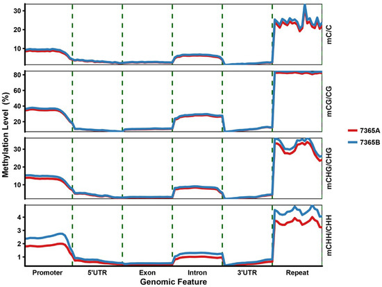 As shown in Figure 2a, 7365B and 7365A showed no significant differences in average methylation levels in the whole genome and under each context. The genome-wide cytosine methylation levels under CG, CHG and CHH contexts were calculated. It is worth noting that among all the sequence contexts, CG had the highest methylation density, followed by CHG and CHH. Although a very low percentage of CHH was methylated, methylated cytosines in the CHH context accounted for a relatively large proportion of the total methylated cytosines (Figure 2b).