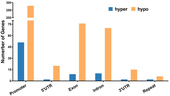Figure 5. Number of hypomethylated and hypermethylated DMGs in gene functional regions. Hypo: hypomethylated; hyper: hypermethylated.
