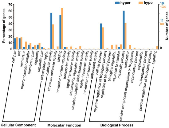 Figure 6. GO analysis of all DMGs. Hypo: hypomethylated; hyper: hypermethylated.