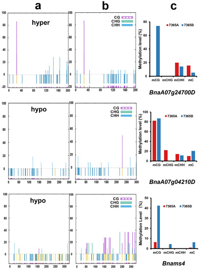 Figure 7. DNA methylation at specific sites of two DMGs and Bnams4 by traditional bisulfite sequencing. (a) Bisulfite PCR results in 7165A; (b) Bisulfite PCR results in 7365B. The vertical axis represents the percentage of methylated sites; the horizontal axis represents the position of cytosine in the DMRs; hypo and hyper represents hypo-methylated and hyper-methylated DMR in 7365A. (c) WGBS results of the corresponding DMR.