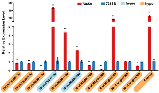 Figure 8. Expression analysis of pollen development-related DMGs and Bnams4. The asterisk indicates a significant difference between 7365A and 7365B (*: p-value < 0.05, **: p-value < 0.01). The Gene ID highlighted in yellow and blue on the vertical axis represents hyper-methylated and hypo-methylated DMRs.