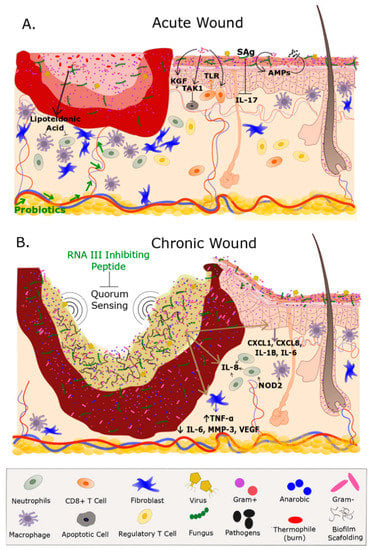 Microbiome, Wound Healing, and Wound Healing Impairment. (A) Acute wounds such as burns and open fractures contain a microbiome that may or not contain a vastly different population than what is on undamaged adjacent skin. The microbes present on an acute wound don’t necessarily impede the inflammatory response therefore allowing for the highly coordinated events that promote wound healing. Several fibroblast, and inflammatory cells such as macrophages, neutrophils, and T Cells are highly involved in the healing process. Production of lipoteichoic acid by S. epidermidis deceases inflammation. Keratinocytes express anti-microbial peptides (AMPs) in response to S. epidermidis, S. aureus, Group A streptococcus which provides protection for pathogenic bacterium. Supplementation with probiotics (e.g., Lactobacillus reuteri) accelerates wound healing although the mechanism is unknown. CD8+ T Cells in response to S. epidermidis enhance rapid keratinocyte progression via Toll-like receptor (TLR). Additionally, Pseudomonas accelerates epithelization and blood vessel growth through transforming growth factor beta-activated kinase 1 (TAK1) signaling. Overabundance of S. aureus produces superantigens (Sag) that are decreases interleukin (IL-17) and subsequently promoting wound healing. Note the greater numbers of healthy fibroblast, macrophages, and neutrophils near the wound bed and the intact vasculature that are essential in the healing process. Adjacent to the wound is undamaged (healthy) skin that contains macrophages, fibroblast, and a healthy ecological community of microorganisms that includes Gram Negatives, Gram Positives, fungi, and viruses within the epidermis and hair shaft; (B) chronic wounds contain a biofilm and a dense population of microorganisms which include anaerobic bacteria that obstruct wound healing by preventing topical antibiotics reaching the wound bed. Quorum sensing within the biofilm promotes biofilm formation, whereas exogenous topicals such as RNA inhibiting peptide inhibits biofilm formation. The biofilm elevates the expression of cytokines IL-1B, IL-6, chemokine ligand (CXCL) 1 and 8. Bacterium in the biofilm increase levels of IL-8 which is a potent neutrophil chemoattractant. Additionally, the biofilm increases levels of TNF-α, and decreases IL-6, MMP-3, and vascular endothelial growth factor (VEGF). Nucleotide-binding oligomerization domain-containing protein 2 (NOD2) stimulates a host response and is highly expressed in chronic wounds. The loss of vasculature to the wound bed further prevents the migration of immune-related factors and delivery of exogenous therapeutics. Fibroblast migration is impeded by biofilm formation Note the hyper-proliferative epidermis on the outer region of the wound bed in an attempt to epithelialize the wound. Although inflammation is present in chronic wounds the overall number of normal functioning fibroblasts and macrophages are low which further prevents healing. Green font represents an exogenous treatment for wound healing.