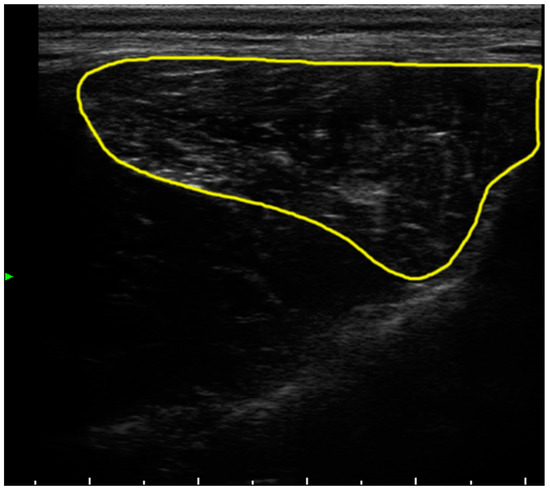 Ultrasonogram of one dog. The approximate contour of the measured lumbar area is delineated in yellow.