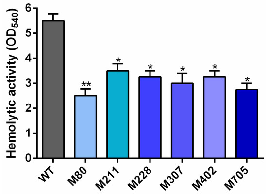 Hemolytic activity of the mutants compared to the wild-type strain. A total of six mutants were identified based on their hemolytic activities. * p < 0.05 or ** p < 0.01.