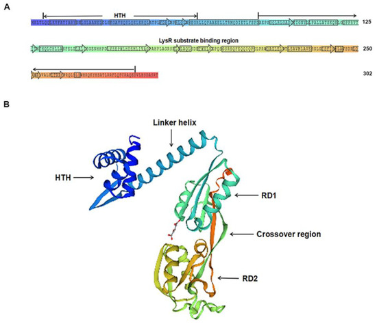 As shown in Figure 1, the M307 mutant exhibited decreased hemolytic activity. A sequence analysis of this strain revealed that the EZ-Tn5-disrupted in this strain encodes a protein belonging to LTTRs. This newly identified gene was designated as lahS. The open reading frame (ORF) of lahS is 909 bp, which encodes a hypothetical 34 kDa protein consisting of 302 amino acid (aa) residues. Secondary structure analysis showed that LahS protein has a conserved N-terminal DNA-binding helix–turn–helix (HTH) motif, which is located at amino acids 5–64 from N terminus (Figure 2A). In addition, there is a LysR substrate binding region that is located at amino acids 87–293, which has the ability to affect the binding capability of this protein. The two domains are connected via a long flexible linker helix that is involved in the oligomerization of the proteins (Figure 2B). The predicted three-dimensional (3D) structure of LahS showed that there are two α/β regulatory domains (RD1 and RD2) in the LysR substrate binding region, which are connected by two crossover regions (Figure 2B).