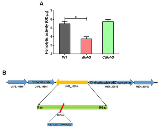 The lahS gene was involved in hemolytic activity of A. hydrophila. (A) Hemolytic activity of the wild-type and lahS mutant strains. A. hydrophila strains were grown overnight in Luria Bertani broth (LB) medium at 28 °C, after which 100 µL of supernatants were added to 1% sheep blood for 1 h at 37 °C. Hemolytic activity was expressed as the values measured at OD540. * p < 0.05. (B) Schematic diagram of the EZ-Tn5 transposon insertion in the lahS gene. The gene cluster shows the location of the lahS gene in the NJ-35 genome. The red rectangle shows the transposon insertion site in lahS.