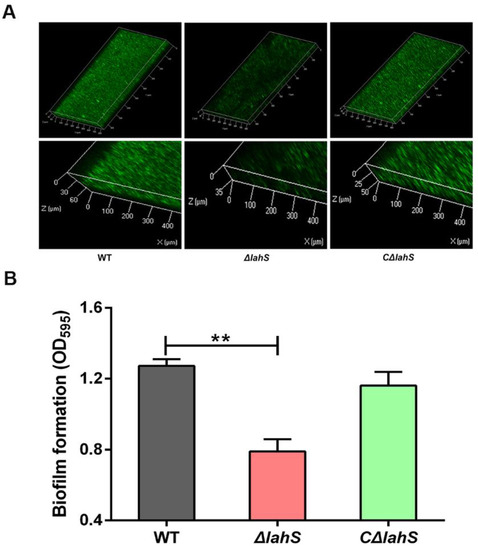 Biofilm formation of the wild-type and lahS mutant strains. (A) CLSM images of biofilms of the wild-type and lahS mutant strains. The viable cells exhibit green fluorescence. (B) Biofilm formation was measured by crystal violet staining using 96-well plates and was expressed as the values measured at OD595. The data are presented as the means ± SEM from three independent experiments. ** p < 0.01.
