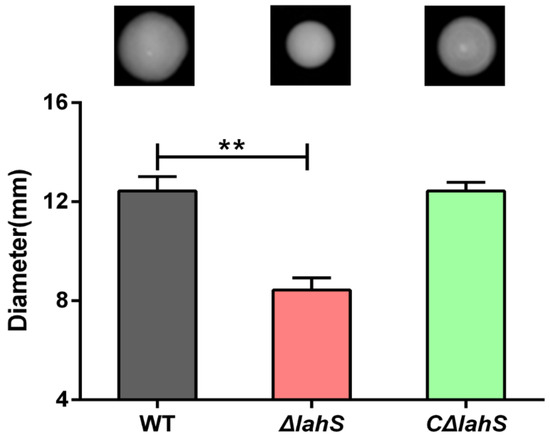 Motility of the wild-type and lahS mutant strains. Swimming ability was observed after culturing strains at 28 °C for 48 h on 0.3% Luria Bertani broth (LB) agar plates. The migration diameters were measured to assess the motility. The results are presented as the means ± SEM from three independent replicates. ** p < 0.01.