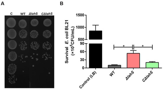 Competition ability of the wild-type and lahS mutant strains. (A) The image of competition ability is shown on Luria Bertani broth (LB) agar plate. (B) Quantification analysis of competition ability of the wild-type and lahS mutant strains. The respective bacterial strains were cultured together at a ratio of 1:1. The competition capability of A. hydrophila strains against E. coli BL21 was defined as the amount of observed E. coli survival after antagonism. Data are presented as the means ± SEM of three independent experiments. * p < 0.05.