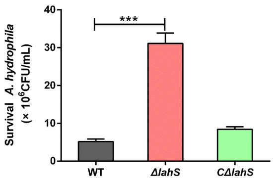 The antioxidant abilities of A. hydrophila strains were determined by treating each strain with H2O2. As shown in Figure 7, the ΔlahS mutant was hyposensitive to H2O2 as compared with the wild-type strain (p < 0.001). The viable cell number of the ΔlahS mutant was six-fold higher than that of the wild-type strain. This anti-oxidation ability was partially restored in the CΔlahS strain. This result suggested that disruption of lahS enhanced the antioxidant capacity of A. hydrophila NJ-35.