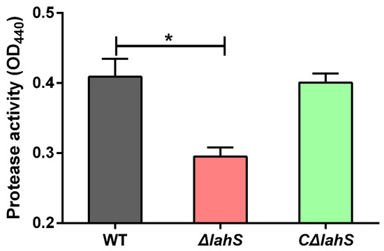 Protease activity of the wild-type and lahS mutant strains. The protease activity was detected using azocasein as a protease substrate and was measured at OD440. Data are presented as the means ± SEM of three independent experiments. * p < 0.05.