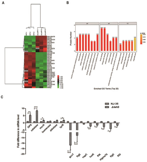To identify the relationship between the 34 different proteins, a hierarchical clustering method based on Pearson’s correlation of variances was applied while using R studio. Figure 10A shows the hierarchical clustering of the 34 identified proteins, where an increasing color intensity indicates increasing protein expression levels. To further understand the functions of these identified proteins, we classified 34 differential proteins by Gene Ontology (GO) categories, including cellular component (CC), molecular function (MF), and biological process (BP) (Figure 10B). According to the analysis of CCs, the majority of the proteins were involved in cell projection and flagellum. According to the analysis of BPs, the primary functions were cellular detoxification and antioxygenation. According to the analysis of MFs, the assayed proteins regulated by LahS could be classified into six categories, as follows: heme binding, tetrapyrole binding, antioxidant activity, catalase activity, peroxidase activity, and oxidoreductase activity. In addition, to determine the accuracy of the mass spectrometry results, 14 of these 34 genes (six of the upregulated genes and eight of the downregulated genes) were randomly selected for further verification by qRT-PCR, the results of which showed that the quantitative PCR results were consistent with the proteomic data (Figure 10C).