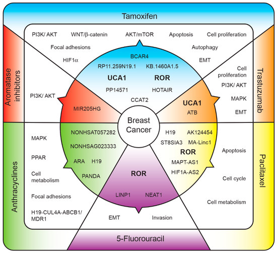 Many more lncRNAs are associated with resistance to tamoxifen than with resistance to other drugs; moreover, its biological role is more deeply described. This may be due to various circumstances such as drug availability, cost benefit, or the sheer fact that tamoxifen is the first-line endocrine treatment in pre- and post-menopausal luminal BC patients.
