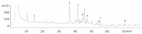 All chromatographic measurements were performed on an Agilent 1200 liquid chromatography system (Agilent, Santa Clara, CA, USA) equipped with avacuum degasser, a quaternary, low-pressure mixing pump, a thermostated column compartment, and an Agilent 1200 photodiode array detector. Chromatographic separation was performed on a Thermo Syncronis RP-C18 column (250 × 4.6 mm, 5 μm, Waltham, MA, USA). The sample solution was filtered through a syringe filter (0.45 μm), and the injection volume was 10 μL. The mobile phase consisted of a 0.1% CF3COOH solution (solvent A) and methanol (solvent B) at a flow rate of 1.0 mL/min. The gradient elution program was performed as follows: 0–20 min, 10–30% B; 20–40 min, 30–60% B; 40–60 min, 60–85% B; 60–80 min, 85–100% B, and then back to the stable initial conditions for another 10 min. The column temperature was maintained at 25 °C and the detection wavelength was set at 210 nm for all of the mixtures. The identification of the investigated mixtures was confirmed by comparison of their retention times with those of standards under the same conditions.