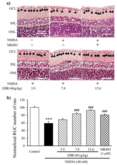 Effect of EBR-84 on the RGCs in NMDA-treated rats. (a) Hematoxylin and eosin (H&E) stained staining images of rat retinas. In the control group, the RGCs of the retinas were compact and clear. Obvious RGC loss was found in the NMDA-treated rats. EBR-84 (3.9, 7.8, and 15.6 g/kg) and MK801 (1 μM) notably prevented the loss of the number of RGCs. The black arrows denote RGCs in GCL. (b) The normalized RGC numbers in rats (n = 5). *** p < 0.001 vs. the control group; ### p < 0.001 vs. the NMDA group. The magnification of all figures is ×200. Scale bar is 50 μm for all images.