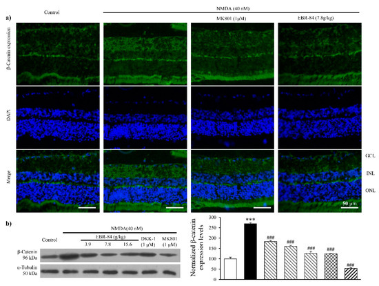 A Western blot result revealed a similar increase in β-catenin expression in the NMDA-treated retina (Figure 3b). Pretreatment of rat retinas with Dickkopf-related protein 1 (DKK-1, 50 ng/mL), which is a specific inhibitor of the Wnt pathway, attenuated the NMDA-stimulated retinal β-catenin increase (p < 0.001). As shown in Figure 3b, the approximately 2.5-fold increase in the retinal β-catenin level induced by NMDA was significantly inhibited in a dose-dependent manner by pretreatment with EBR-84 at concentrations of 3.7, 7.8, and 15.6 g/kg, which reduced retinal β-catenin by more than 85%, 58%, and 142%, respectively (p < 0.001). These results suggested that the protective effect of EBR-84 on the NMDA-damaged retinas might have been due to inhibition of the β-catenin pathway.