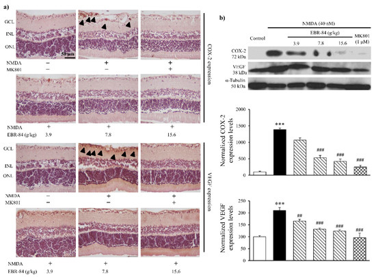 The effects of EBR-84 on the expression levels of COX-2 and VEGF in the retinas of NMDA-treated rats. (a) Representative images for immunohistochemical staining of COX-2 and VEGF in the rat retinas. The arrowheads denote the expression of COX-2 or VEGF. (b) Quantities of COX-2 and VEGF expression levels using Western blot analysis in the retina of rats (n = 5). *** p < 0.001 vs. the control group; ## p < 0.01 and ### p < 0.001 vs. the NMDA group. The magnification of all figures is ×200. Scale bar is 50 μm for all images.