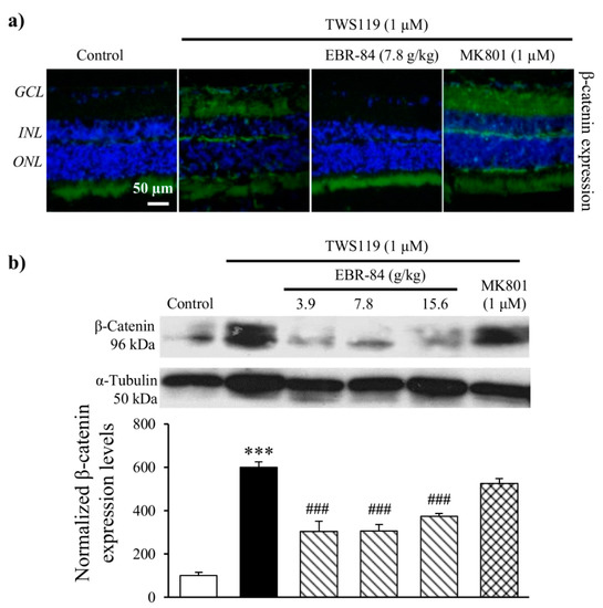 To further elucidate whether EBR-84 protects NMDA-damaged retinasby inhibiting β-catenin signaling activation, we injected the rats with 1 μM TWS119, which mimics the canonical β-catenin signaling pathway by inhibiting GSK-3β [19,20]. As shown in Figure 5a, TWS119 led to β-catenin accumulation in the RGCL of rats, while minimal β-catenin accumulation was observed in the RGCL of normal rats. This illustrates that the β-catenin signaling pathway was successfully activated by TWS119 (1 μM). EBR-84 relieved the robust β-catenin accumulation. MK801 (1 μM) showed a limited effect on TWS119-induced overexpression of β-catenin. The inhibitory function was clearly shown by the Western blot result (Figure 5b). β-Catenin expression in the retinas of the EBR-84 (3.9, 7.8 and 15.6 g/kg) treated-rats was only half that of model rats (p < 0.001).