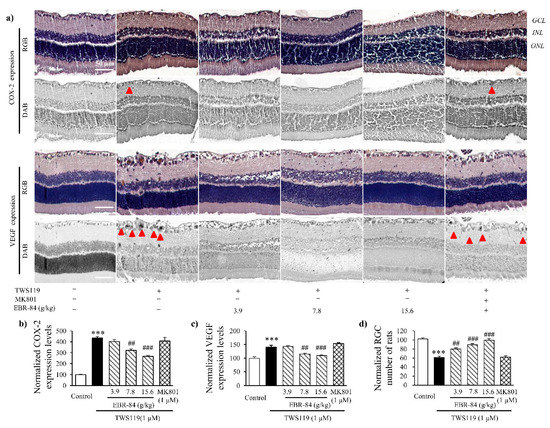 The effects of EBR-84 on COX-2 and VEGF expression and RGC number in the retinas of TWS119-treated rats. (a) Representative multispectral images for immunohistochemical staining of COX-2 and VEGF in the rat retinas. The red arrows denote the places that express COX-2 and VEGF in GCL. (b) Quantification of normalized COX-2 expression level using multispectral image analysis in the rat retinas (n = 5). (c) Quantification of normalized VEGF expression level using multispectral image analysis in the rat retinas (n = 5). (d) The normalized RGC numbersin rats (n = 5). *** p < 0.001 vs. the control group; ## p < 0.01 and ### p < 0.001 vs. the TWS119 group. The magnification of all figures is ×200. Scale bar is 50 μm for all images.
