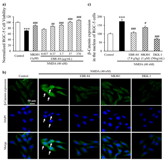 The effect of EBR-84 on cell viability and β-catenin expression of NMDA-treated RGC-5 cells. (a) The viability levels of RGC-5 cells in each group were normalized by that of the control group (n = 6). *** p < 0.001 vs. the control group; ## p < 0.01 and ### p < 0.001 vs. the NMDA group. (b) Representative immunofluorescence staining images for β-catenin expression in the RGC-5 cells. The arrows denote the expression of β-catenin in the nuclei of RGC-5 cells. (c) Fluorescence intensity for β-catenin expression in the nuclei of RGC-5 cells. The fluorescence intensity of β-catenin in each group was normalized to that of the control group (n = 6). *** p < 0.001 vs. the control group; # p < 0.05 and ### p < 0.001 vs. the NMDA group. The magnification of all figures is ×200. Scale bar is 50 μm for all images.