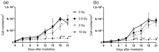Radiation-induced changes in the proliferation capacity were monitored in primary and in SGBS pre-adipocytes over 21 days. The proliferation pattern of primary pre-adipocytes was very similar to that of SGBS pre-adipocytes (Figure 1a,b, respectively). In response to irradiation, the increase in cell numbers for both cell types was lower compared to sham-irradiated controls, which was visible from day 12 on. At the lowest dose (0.5 Gy), irradiation of pre-adipocytes caused no remarkable changes compared to controls, whereas SGBS cells were more sensitive, i.e., already showed lower cell numbers at 0.5 Gy compared to controls. Exposure to 2 Gy X-rays resulted in a strongly reduced proliferation capacity for both primary and SGBS cells, whereas proliferation of the cells exposed to 10 Gy was completely inhibited in both cell types.
