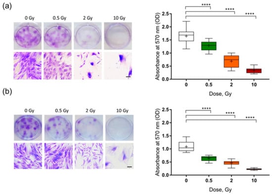 Clonogenic capacity of human pre-adipocytes after X-ray irradiation. (a) Human primary pre-adipocytes and (b) SGBS pre-adipocytes were exposed to 0.5, 2 and 10 Gy X-rays. Staining with crystal violet and quantitative analysis was performed on day 14. Boxplots show the median, Tukey whiskers (median ± 1.5 times interquartile range), and mean (+). N = 6, **** p ≤ 0.0001, using a two-tailed t-test. Scale bar represents 100 µm.