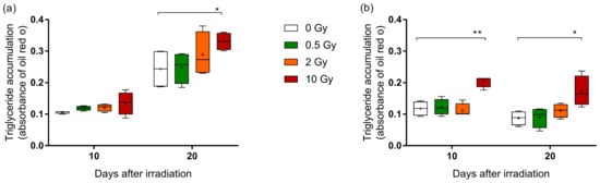 Effect of X-ray irradiation on triglyceride accumulation in human adipocytes. (a) Human primary pre-adipocytes and (b) SGBS pre-adipocytes were exposed to 0.5, 2, and 10 Gy X-rays and differentiation was initiated. The quantification of triglyceride accumulation was performed on day 10 and 20 after irradiation (medium change was not performed). Boxplots show the median, Tukey whiskers (median ± 1.5 times interquartile range) and mean (+). N = 4, * p ≤ 0.05, ** p ≤ 0.01, using a two-tailed t-test.