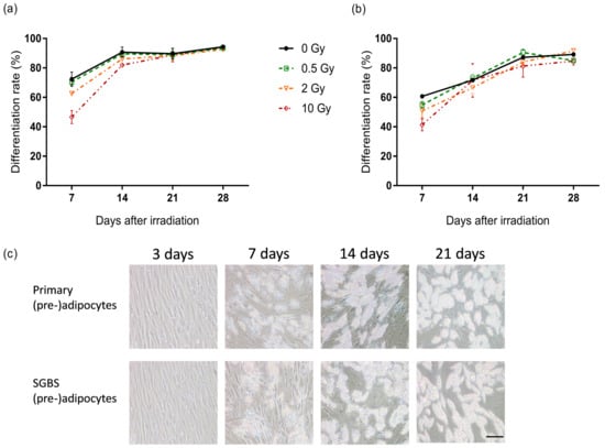 To further characterize the effects of X-ray irradiation on the differentiation process of (pre-)adipocytes, the percentage of differentiated cells (differentiation rate) was evaluated over time in both cell types, starting on day 7, since intracellular lipid droplets are only visible from this stage on (Figure 4c). Representative Oil Red O stainings were given in Figure S1. As shown in Figure 4a,b, already on day 7 after onset of differentiation, sham-irradiated primary and SGBS cells reached a differentiation rate of 72% and 61% respectively. This increased to 90% (primary cells) and 87% (SGBS cells) by day 21. At this time point, the differentiation was accomplished; longer cultivation of the cells did not result in a further increase of differentiated cells. Radiation-induced changes of the differentiation process were not detectable, except a slight, dose-dependent delay of the differentiation rate at day 7 observed in both cell types. However, in both cases this effect became weaker in the course of further cultivation.
