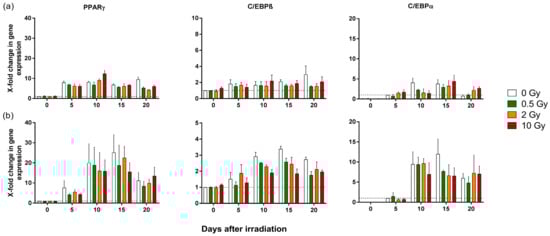 At the molecular level, adipogenesis is characterized by a tightly regulated interplay of stimulatory and inhibitory transcription factors. The critical factors for the complete and seamless adipocyte development are the Perixosome proliferator-activated receptor gamma (PPARγ) and the CCAAT/enhancer-binding proteins (C/EBPs), which are rapidly expressed after the induction of differentiation []. Therefore, as a next step, the impact of X-ray irradiation on the expression of these major adipogenic transcription factors (PPARγ, C/EBPβ and C/EBPα) were investigated. After irradiation and initiation of differentiation, RNA from both primary and SGBS cells were isolated at the indicated time points. Although no significant differences in the expression of PPARγ, C/EBPβ, and C/EBPα between irradiated and sham-irradiated cells were found, the analysis revealed a trend towards a reduced expression level of these genes (Figure 5). Notably, primary (pre-)adipocytes (Figure 5a) showed much lower expression levels of adipogenic transcription factors during differentiation compared to SGBS cells (Figure 5b), although the temporal pattern of gene expression was found to be very similar.