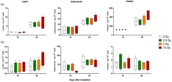 Effect of X-ray irradiation on the adipokine release by human adipocytes. (a) Human primary pre-adipocytes and (b) SGBS pre-adipocytes were exposed to 0.5, 2 and 10 Gy X-rays and differentiation was initiated. Cell supernatants were collected on day 10 and 20 after irradiation and the amount of adipokines leptin, adiponectin, and visfatin were measured using enzyme-linked immunosorbent assay ELISA. Boxplots show the median, Tukey whiskers (median ± 1.5 times interquartile range) and mean (+). X-axis represents days after irradiation and Y-axis is the amount of adipokines released. N = 4, * value below detection limit.