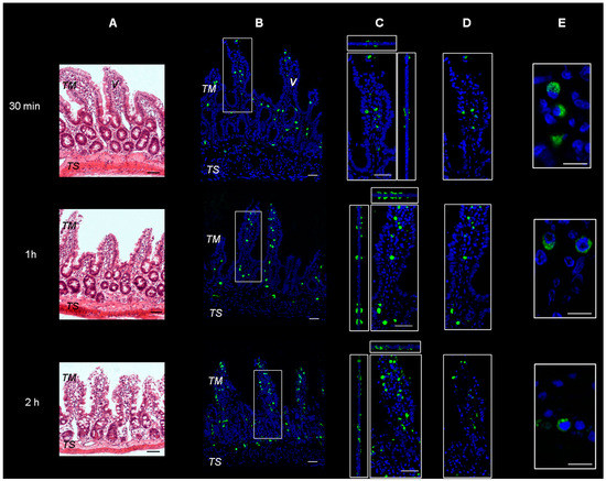 The more magnified images in Figure 1E and Figure 2 show that the green fluorescence is due to particulate structures. These are observed in enterocytes and in connective tissue cells incubated with SRM up to 1 h, while after 2 h incubation, fluorescent particles are only localized in connective cells. This is a clear sign of particle transit across the full thickness of the intestinal barrier, which would mainly be governed by a biological mechanism.