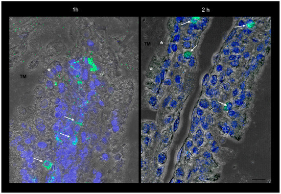 Confocal laser scanning microscopy: representative images of rat gut sections after 1 and 2 h incubation in an Ussing chamber. Asterisks indicate enterocytes; arrows indicate connective cells. TM: tunica mucosa. Individual fluorescent channels: green (SRM) and blue (nuclei). Scale bar 10 µm.