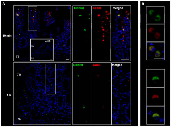 Confocal laser scanning microscopy: representative images of rat gut sections after 0.5 and 1 h incubation in Ussing chamber. Negative controls obtained omitting primary antibodies are shown in double line squares. Individual fluorescent channels: green (SRM), red (CD68 + cells) and blue (nuclei). (A) Bidimensional image of the maximum intensity projection. Scale bar 25 µm. (B) Images acquired in one Z-plane (29th of 47 and 26th of 40, incubated 0.5 and 1 h, respectively) at a magnification of different sections higher than that of (A). Scale bar 10 µm.