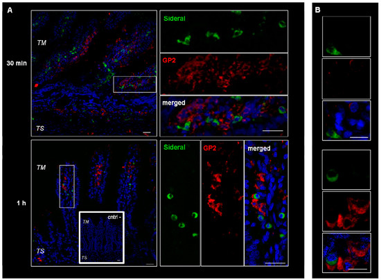 Confocal laser scanning microscopy: representative images of rat gut sections after 0.5 and 1 h incubation in Ussing chamber. Negative controls obtained omitting primary antibodies are shown in double line squares. Individual fluorescent channels: green (SRM), red (GP2 + cells) and blue (nuclei). (A) bidimensional image of the maximum intensity projection. Scale bar 25 µm. (B) Images acquired in one Z-plane (38th of 59, 22nd of 64, incubated 0.5 h and 1 h, respectively) at a higher magnification. Scale bar 10 µm.