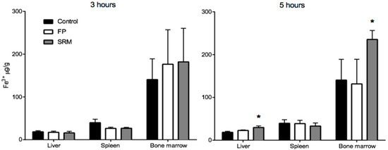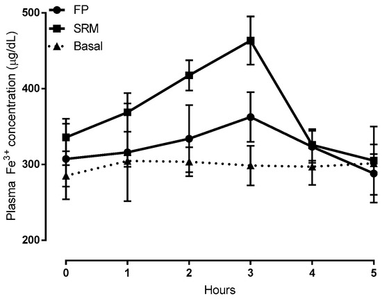 Hence, it can be stated that SRM is able not only to increase iron bioavailability, but also to keep correct levels of Fe3+ in the blood for longer than FP.